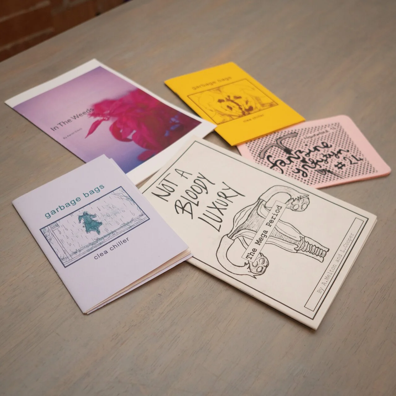 Zines about Endometriosis from Wasted Ink Zine Distro and Charissa’s personal collection.
