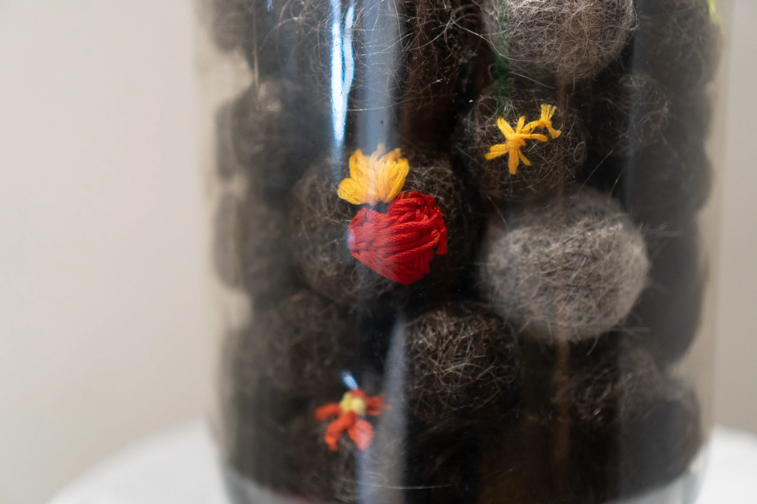 Most hair balls were created as a result of everyday grooming and are records of the artist's daily life. Some balls hold more significance and were created from hair cut in ceremony — hair was cut to honor a woman changing, to mourn an uncle's passing, to manage chemotherapy symptoms and fight for life. Some hair balls were created from hair collected from beloved animals. Colorful cotton thread was used to embroider symbols of importance to the family. Different religious and spiritual symbols are found on the balls as individuals in the family have understood creation and the Creator differently over time.