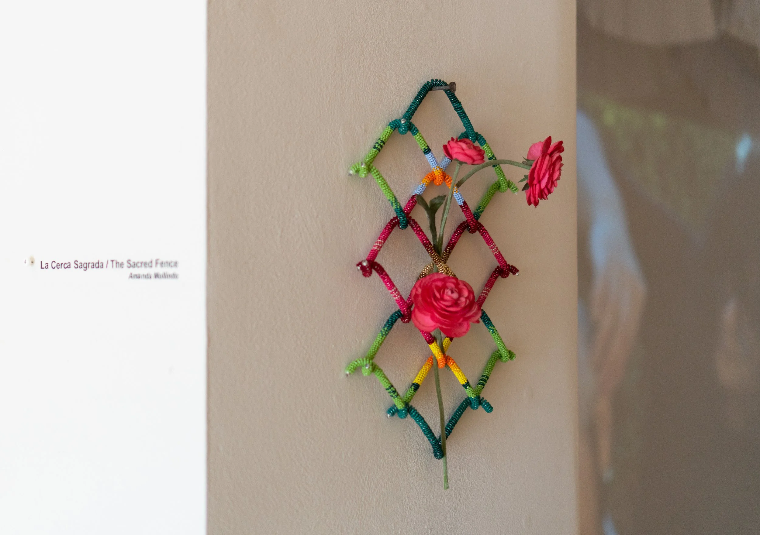 La Cerca Sagrada is a mixed media piece centered around a hand beaded fragment of chain link fence. It is combined with an audio recording documenting the Rosary Recitation at my nana’s (paternal grandmother) funeral on October 2023.