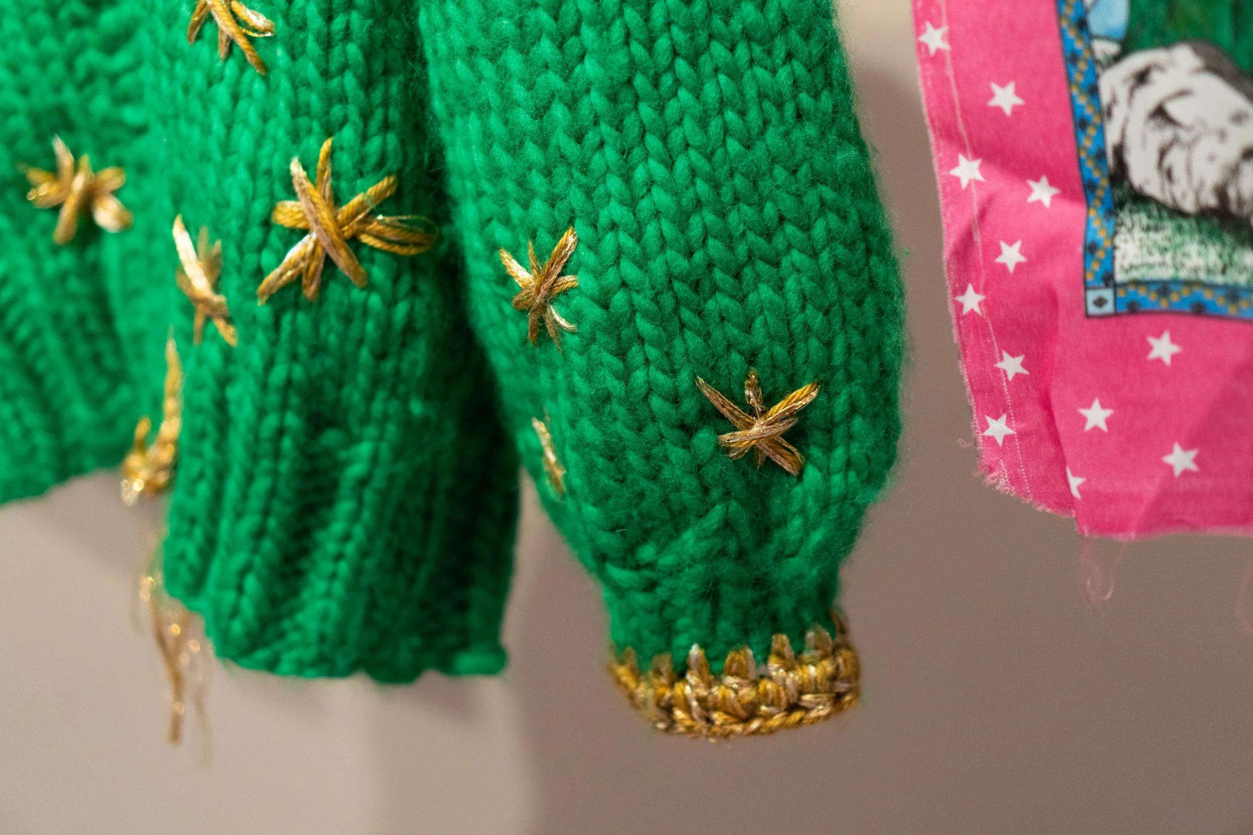 Roberto’s knitted cardigan, Abrazo Materno, was accompanied by two panels found in my nana’s fabric collection.